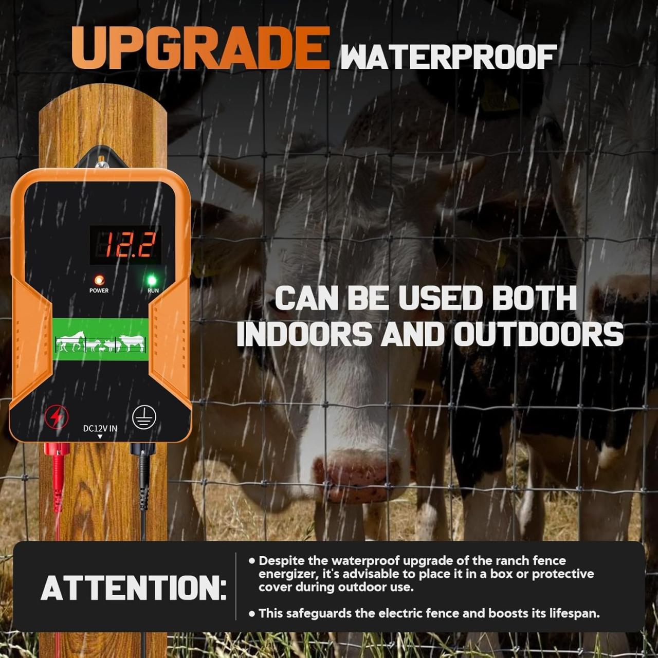 Plage de contrôle efficace à haute production d’énergie: Jusqu’à 2.0 joules de puissance de sortie, la conception durable offre une excellente fonction étanche, ce qui rend l’électrificateur de clôture électrique normalement utilisé même dans des conditions météorologiques extrêmes, mais il est préférable de le placer à l’intérieur ou à sec dans une boîte ou sous le toit.