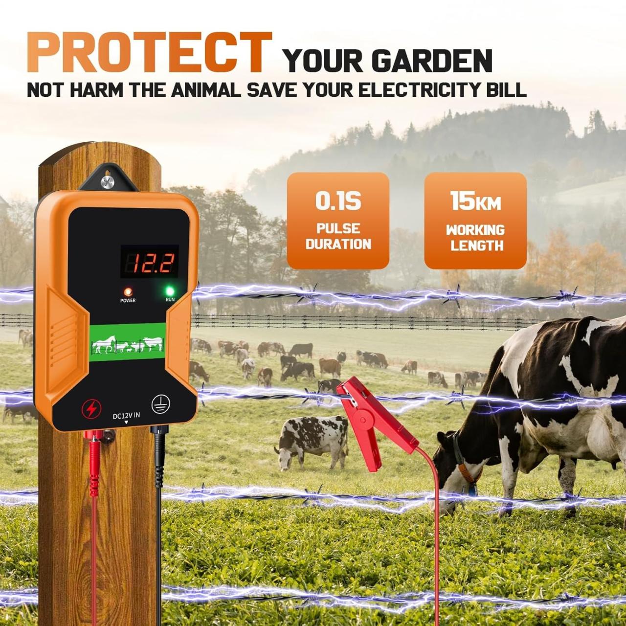 Electrificateur cloture electrique: Tension de sortie 12KV, Distance efficace de clôture électrique (sans couverture végétale) jusqu’à 15 km, suffisamment pour répondre aux différents besoins de la scène, pour mieux contrôler le bétail et prévenir les prédateurs.