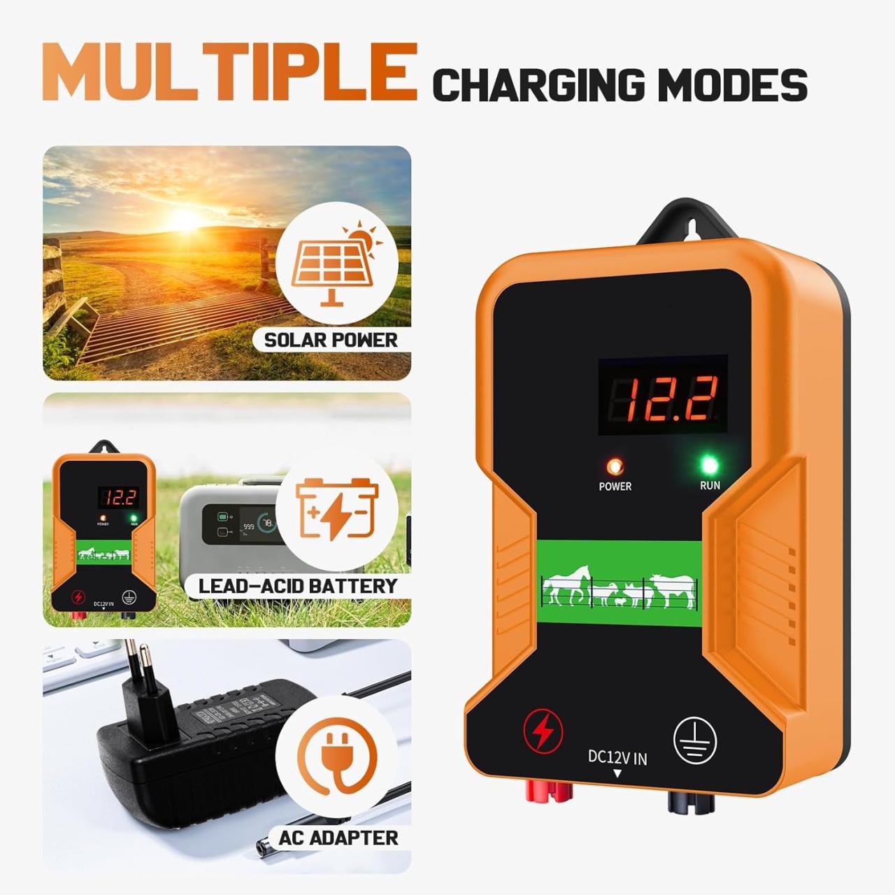 Option 3 Méthode d’alimentation: 1.Adaptateur de charge AC100-240V 50/60 Hz. 2.Batteries au plomb DC12V (à acheter soi-même). 3.Panneaux solaires, convertisseur solaire et batteries au plomb DC12V (à acheter soi-même). Le chargeur de clôture électronique est portable et peut être alimenté par une prise AC et une batterie DC, ce qui le rend adapté pour une utilisation dans les zones reculées sans électricité.