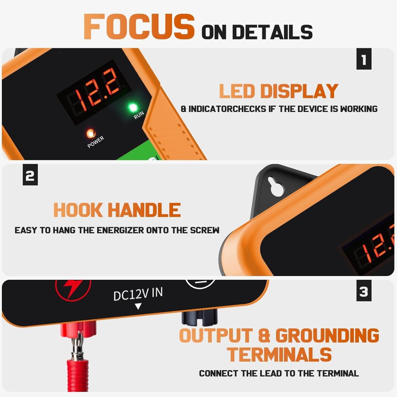 Installation pratique: Équipé d’un trou de montage, ce qui facilite une installation pratique. ce kit de clôture électronique est livré en standard avec 2 bornes, dont 1 est une borne de terre de clôture pour la connexion à un système de mise à la terre indépendant, et l’autre est une borne de sortie de clôture pour la connexion à une clôture. Remarque : Pour éviter tout risque de choc électrique pour les piétons, affichez des panneaux d’avertissement après l’installation.