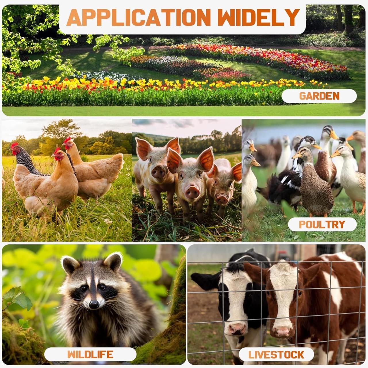 Domaines d’application de cette clôture de ferme électrique : ferme avicole, ferme à gibier, forêt, centre de plantation de légumes et de fruits, confinement du bétail, jardin de fleurs et autres. Animaux à contenir vache, mouton, bovin, cheval, cerf, ours, éléphant, cochon, chèvre, poulet, chien, souris laveur, animaux exotiques et prédateurs, etc.