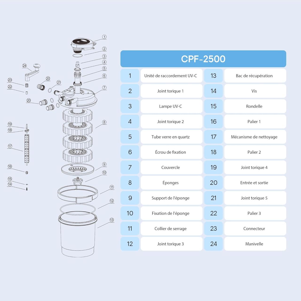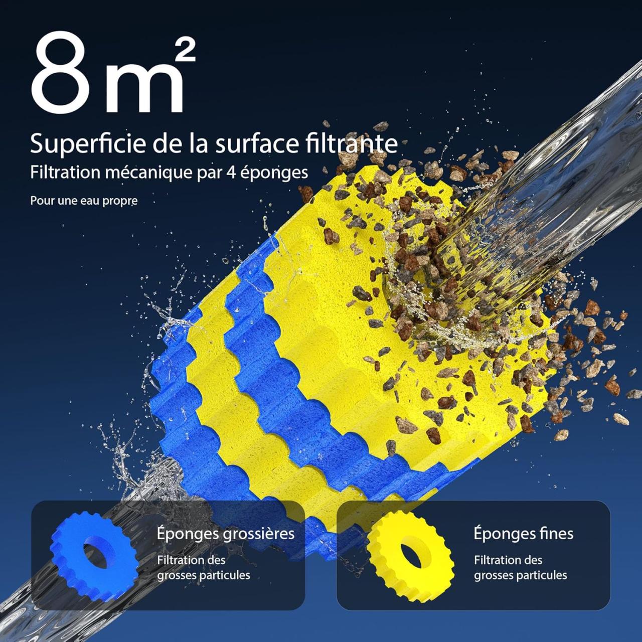 [Filtration UV] – Le filtre est équipé d’une unité UV qui stérilise l’eau en détruisant les algues à l’aide de rayons ultraviolets. Les algues se regroupent en grandes particules, qui sont ensuite éliminées via la filtration mécanique, assurant ainsi une eau cristalline sans prolifération d’algues ni impuretés – puissance de filtre UV 11 W, puissance de pompe 6 000 l/h
